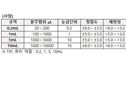 ● 소형, 경량형 타입 ● 4종류로 20μL~10,000μL(10mL)까지 샘플링에 가능 ● 접액부는 유리 팁(경질 유리제) ● 용량 설정은 푸시버튼을 회전시켜 원터치 잠금 나사로 고정 ● 본체 기밀부는 PTFE 사용 ● 그립부분의 형상은 조작성을 고려한 설계 ● 손의 온도에 의한 정밀도 변화가 잘 생기지 않는 기구